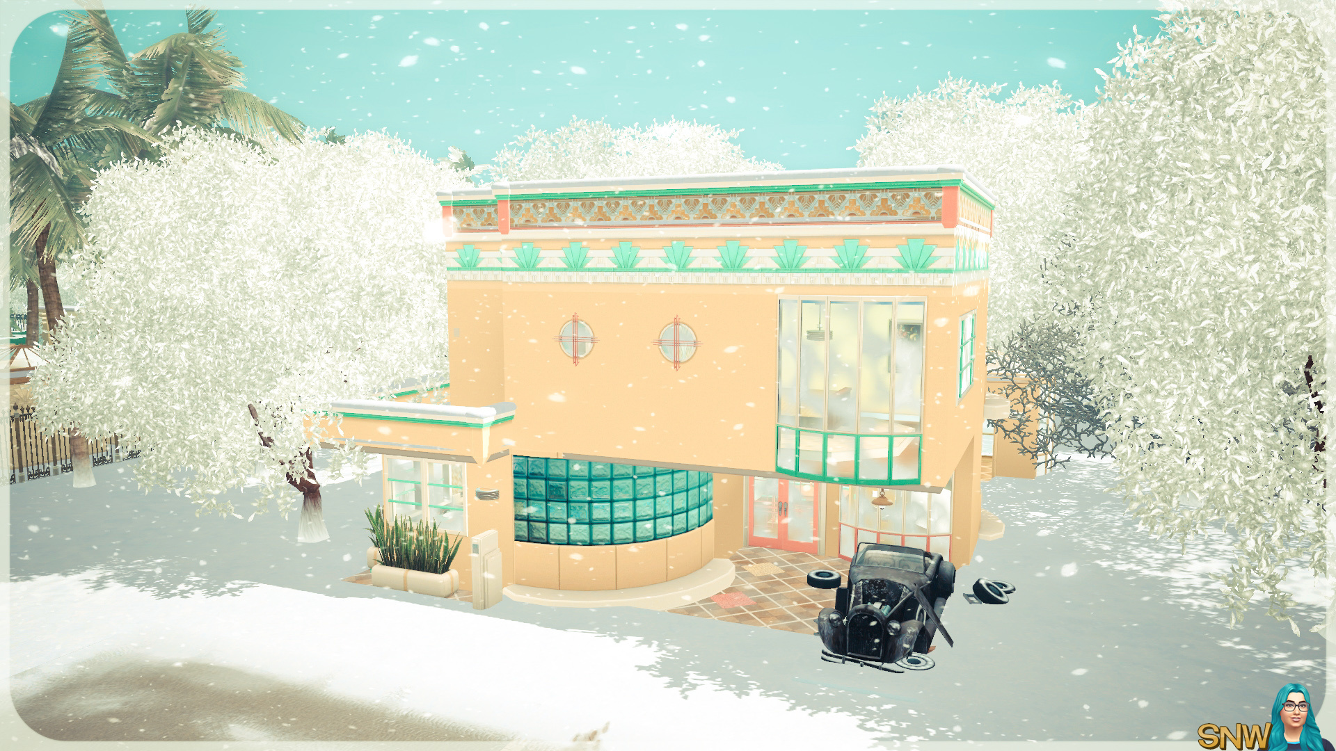 Weer een Art Deco huis! Deze is lekker zonnig met geel, mint, en roze! Het ziet er in alle seizoenen leuk uit. Maar ik vind het er vooral prachtig uitzien in de sneeuw. En ook tijdens zonsondergang. Het is zo mooi!