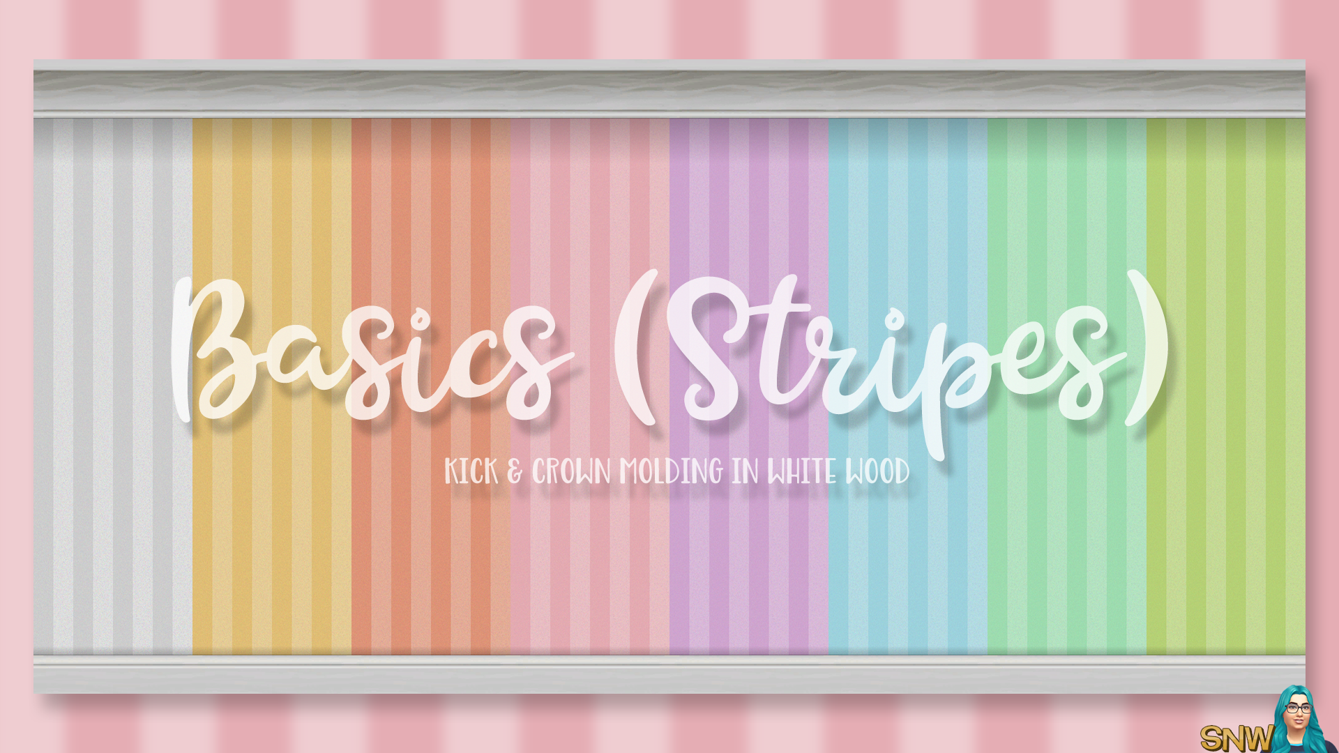 Deze muur is onderdeel van de Basics Wallpapers set. Het is een gestreepte muur. De muren hebben witte houten plinten en kroonlijsten. Er zijn 32 kleuropties om uit te kiezen.