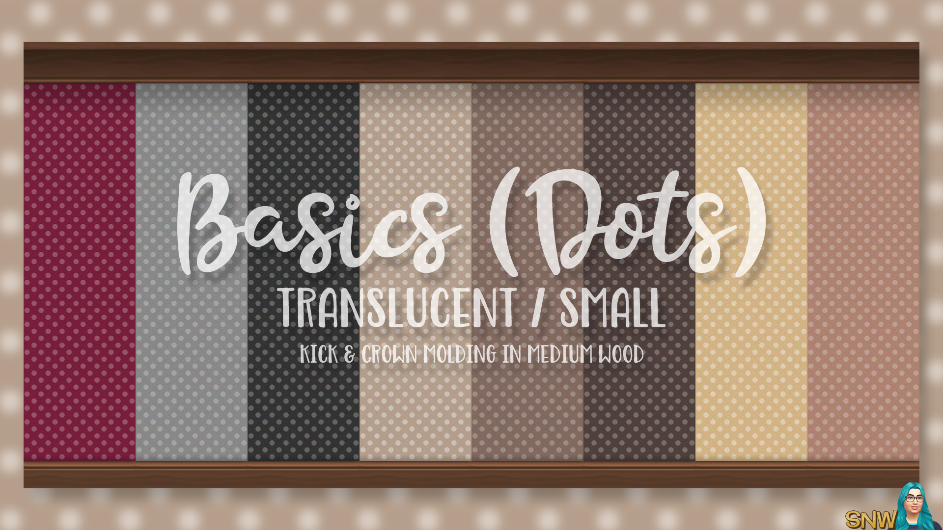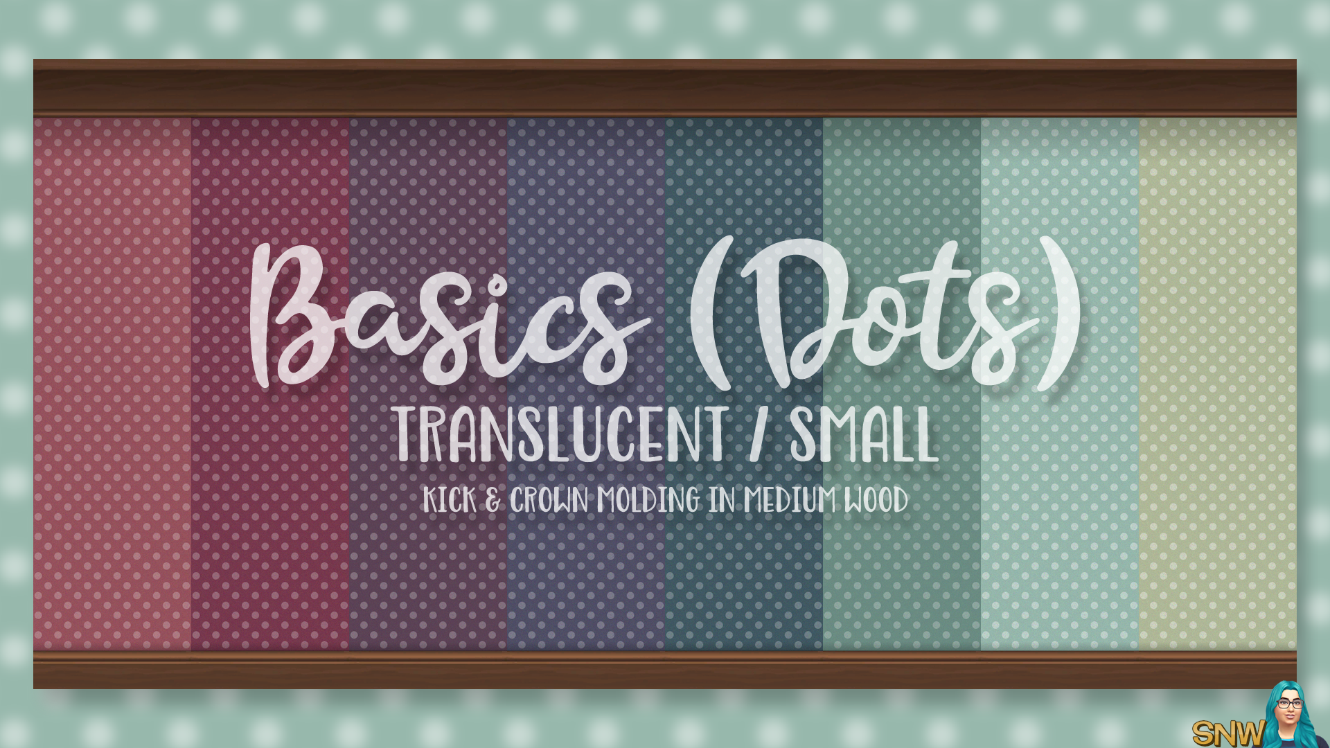 Deze muur is onderdeel van de Basics Wallpapers set. Het is een semi-transparante, kleine stippen muur. De muren hebben medium houten plinten en kroonlijsten. Er zijn 32 kleuropties om uit te kiezen.