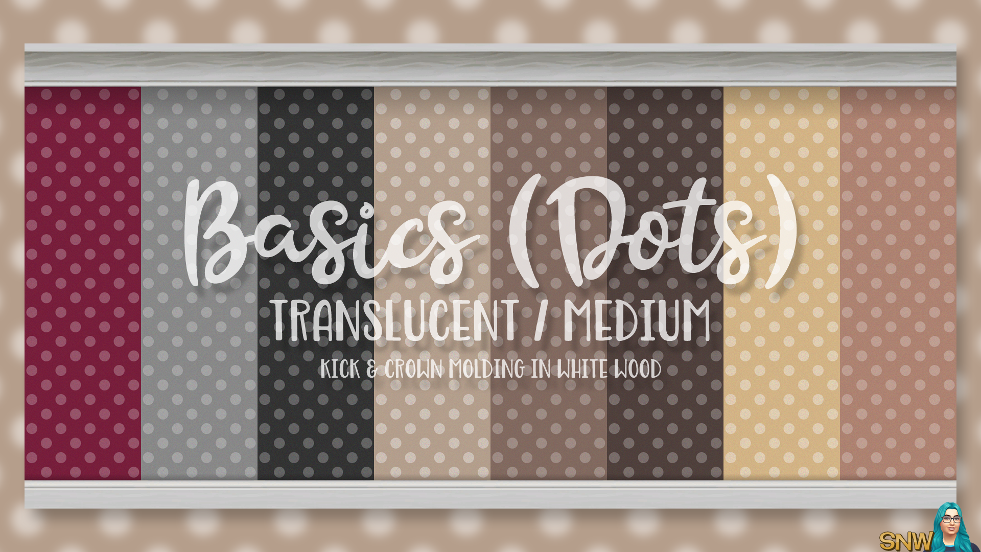 Deze muur is onderdeel van de Basics Wallpapers set. Het is een semi-transparante, medium stippen muur. De muren hebben witte houten plinten en kroonlijsten. Er zijn 32 kleuropties om uit te kiezen.