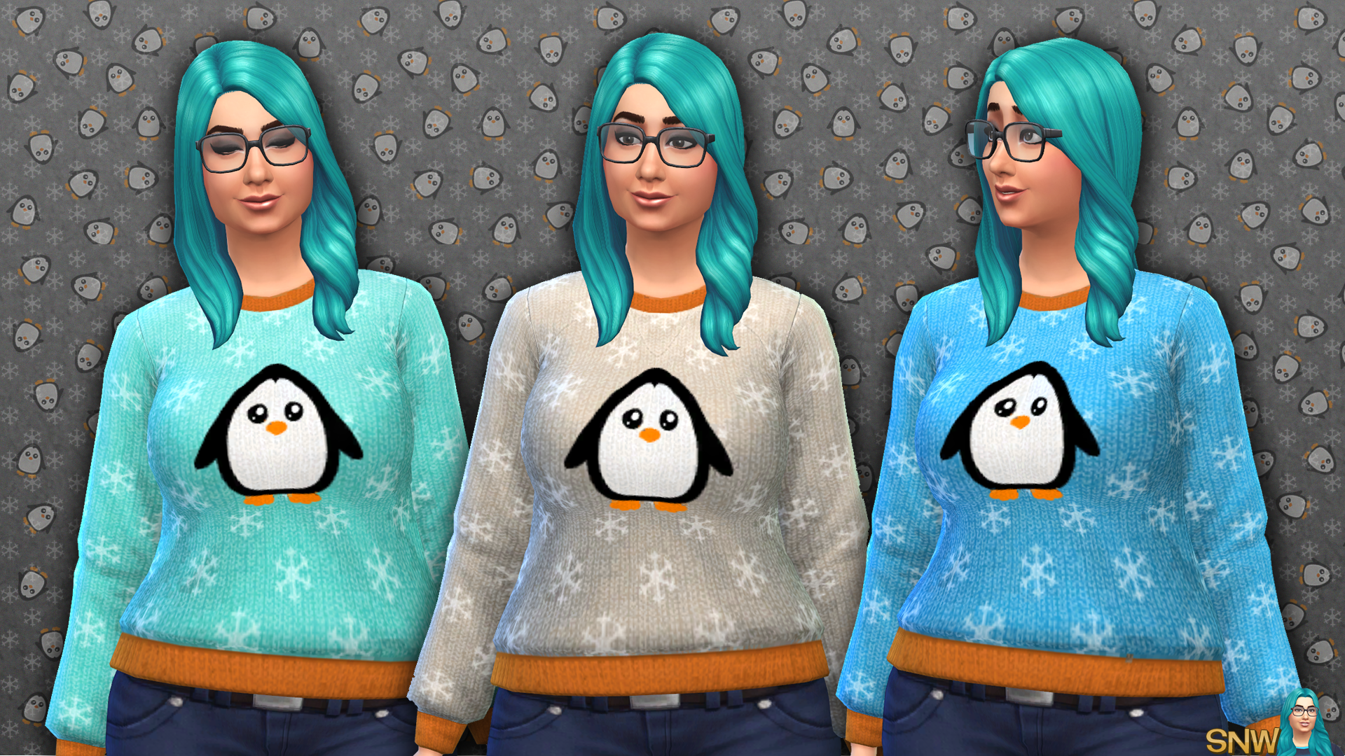 Ik heb een schattige pinguïnillustratie gemaakt voor Simsmas 2015, die ik gebruik om leuke wintertruien voor mijn Simmetjes te maken! Ik heb een aantal variaties gemaakt. Dit is de variant met de pinguïn. Er is ook een set truien met pinguïns met kerstmutsen op. En nog een set truien met een pinguïnpatroon!
