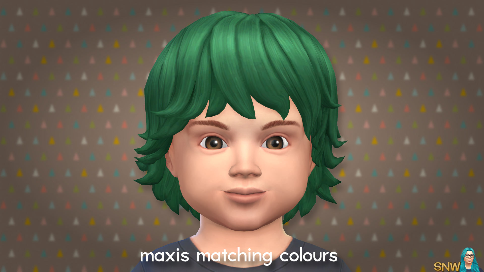 Je weet wel hoe tieners, (jong)volwassenen en ouderen allemaal 18 kleuropties per kapsel hebben he? Nou, kinderen en peuters hebben niet al die kleuren. Kinderen en peuters hebben 9 kleuropties per kapsel. En hoewel ik snap dat grijs/grijzend haar nogal raar staat bij een kind of peuter, vind ik de felle, funky kleuren in het spel wel heel erg leuk. Dus ik heb besloten om 5 funky kleuren per kapsel te maken voor de peuters: