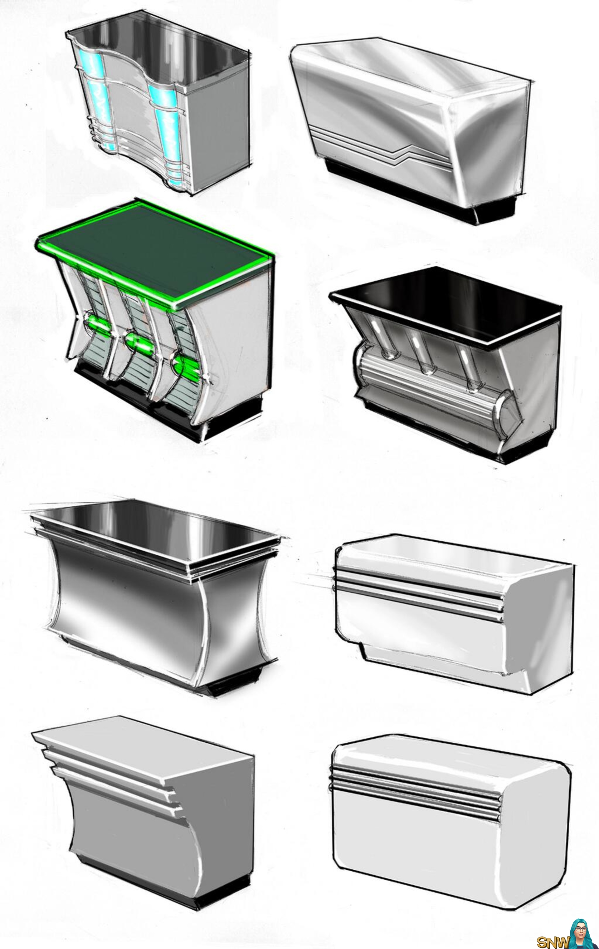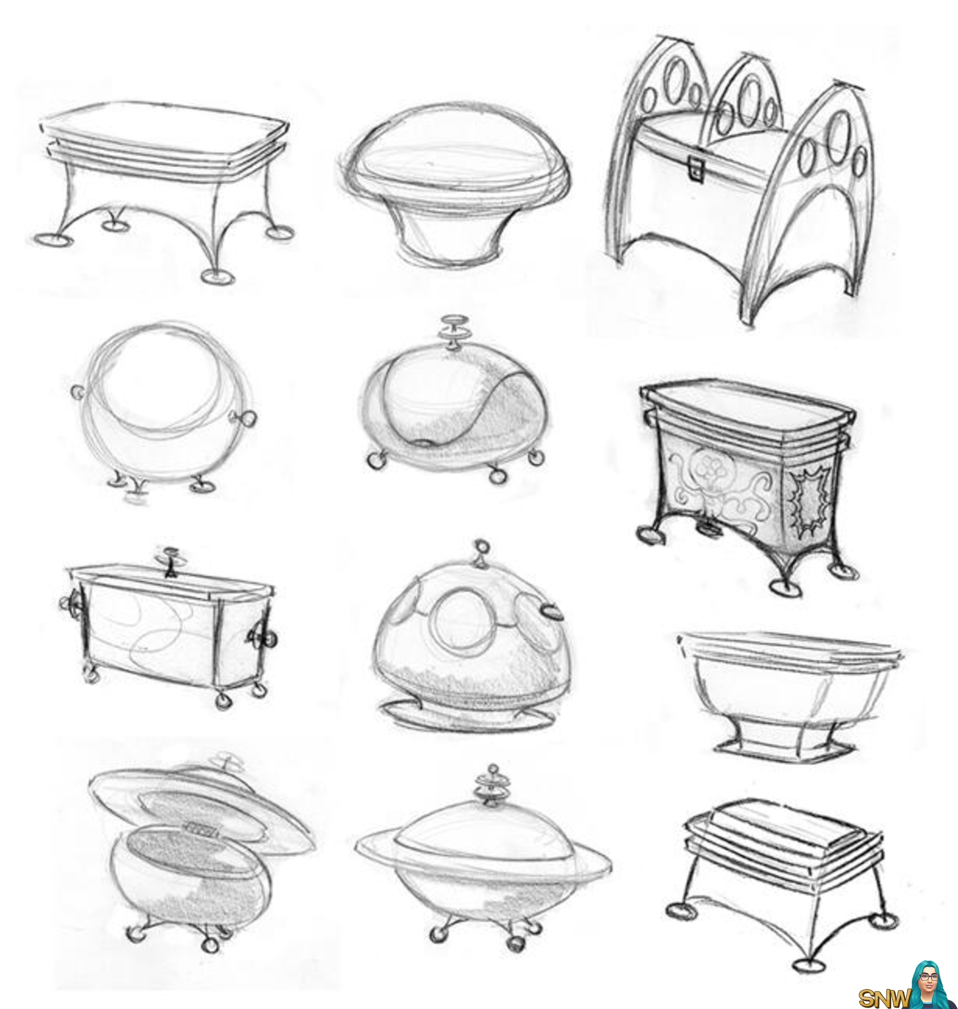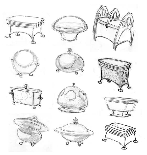 Concept art featuring multiple options for atomic age toy boxes in The Sims 2 Pets. I like like the octopus alien