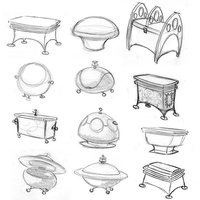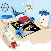 Concept art featuring a collection of beds and table lamps from the atomic theme in The Sims 2 Pets.