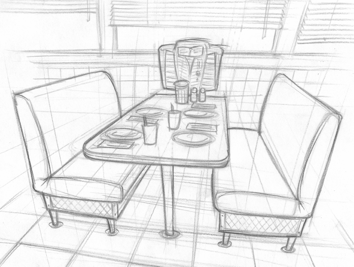 I have line drawing concept art today from The Sims 2 Nightlife restaurants! This is a diner booth.