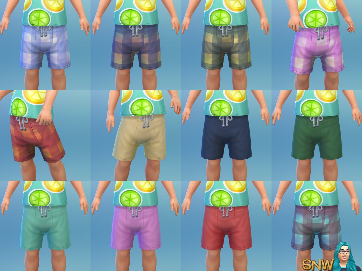 The long trousers on the left come in 12 colour options. It's a mix of plain coloured trousers, and camouflage/army trouwsers. The shorts on the right also come in 12 colour options. Half of them are plain coloured, the other half are checkered.