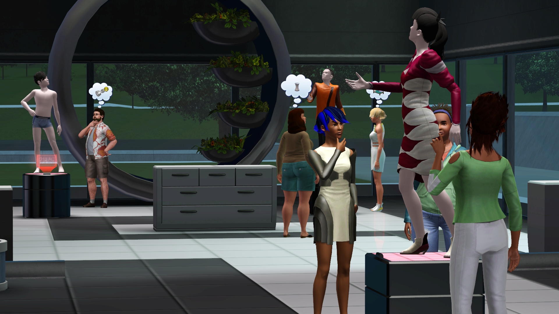 Are you fond of being a real estate tycoon? With enough simoleons lining your pocket a Sim can purchase the EP-XI Import Gallery (and other lots in the world) where, using the Retail Display Pedestal, a player can fully influence what Sims in Oasis Landing will wear. To purchase this shop just pull out your cell phone, choose Real Estate and Travel Services and Check Real Estate, this will bring up a full listing of purchasable lots in Oasis Landing. Find EP-XI Import Gallery in this list and invest away! When your Sim is at the Import Gallery they will have new interactions with the Clothing Pedestals. These Clothing Pedestals are by far my favorite feature I've ever designed for a Sims expansion. We as a design and production team have been trying to get mannequin displays into the game for a while, but it wasn't until Into the Future that we were able to find a way around the technical restrictions that these awesome objects presented.